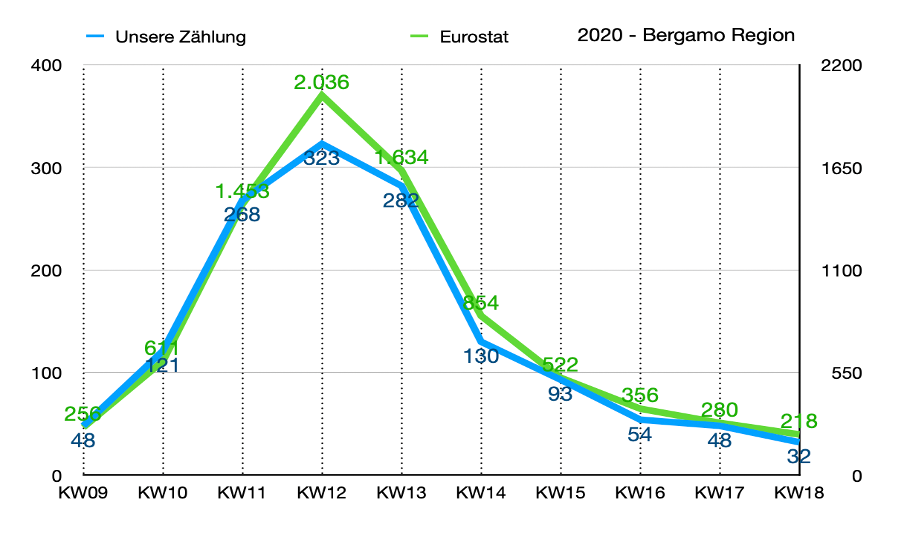 Das Bergamo-Phänomen steht letztlich für wenige kurzzeitige Peaks der Sterblichkeit in Europa durch das Wuhan-Virus, das bestimmte Cluster mit einer hohen Virusdichte infiziert hat. Der weitere Verlauf der Pandemie vor der Impfung wurde vor allem von einer zunehmenden Immunität (insbesondere Schleimhaut-Immunität) und den Mutationen des Virus bestimmt.