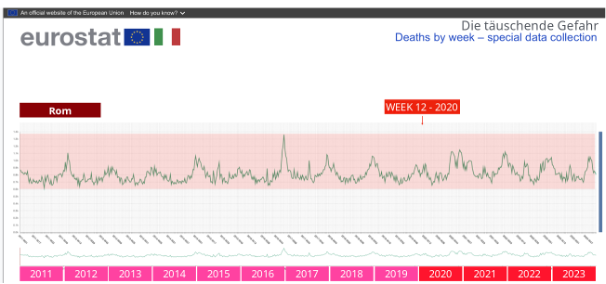 Dann erschreckten im März 2020 Meldungen und Bilder aus Bergamo die Welt. Die später immer wieder gezeigten Militärlastwagen mit Särgen haben diesen Eindruck verstärkt und verfestigt. Der Letalitäts-Peak in der Region Bergamo (ca. 1,1 Mio. Einwohner) hatte erhebliche politische Auswirkungen und ist als Kategorie „wöchentliche Todesfälle“ in Abb. 1 dargestellt (6). Etwa in der 12. Kalenderwoche 2020 kam es im Bezirk Bergamo zu einer plötzlichen Verzehnfachung der Letalität im Vergleich zum Wochendurchschnitt der Vorjahre. Die erhöhte Letalität war für ca. 3-4 Wochen zu beobachten, danach verschwand sie wieder.